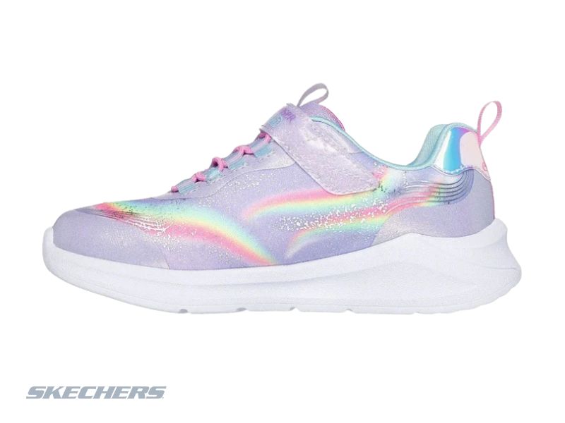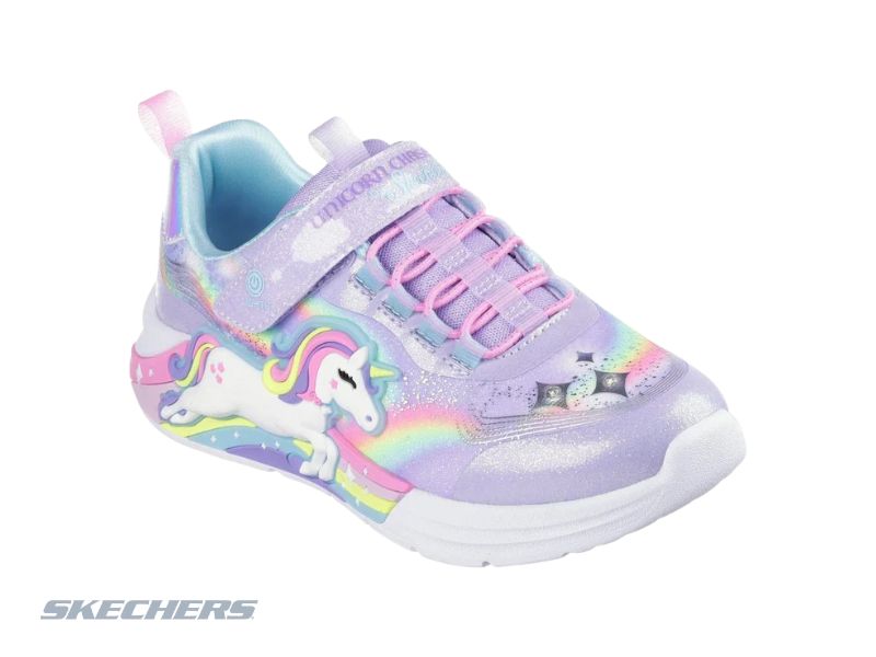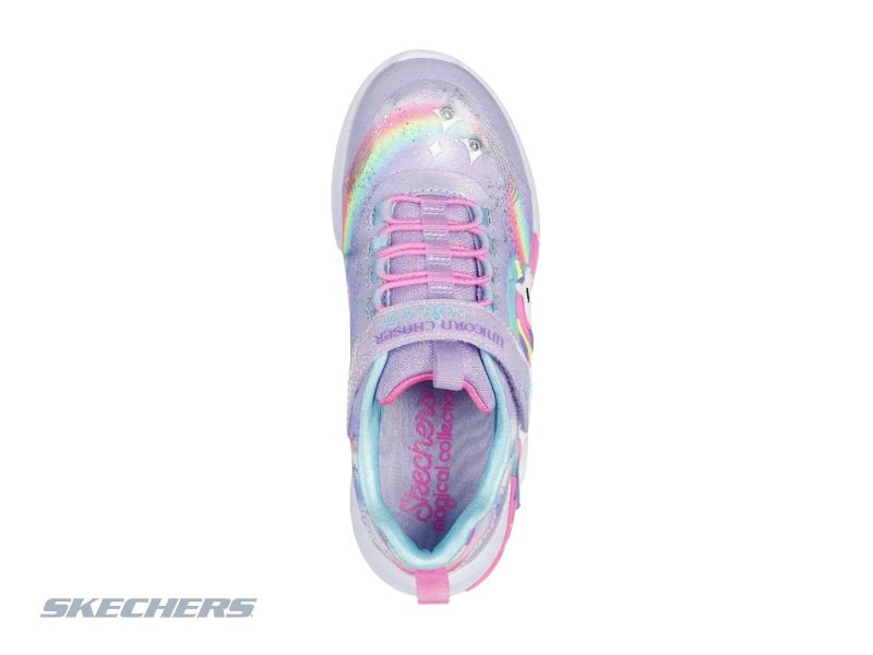 Zapatillas Skechers Unicorn Chaser para niña con capellada sintética brillante con diseño de unicornio, cordones elásticos y ajuste con abrojo, luces en la suela y diseño cómodo ideal para el uso diario.