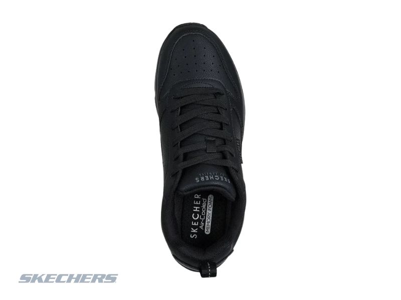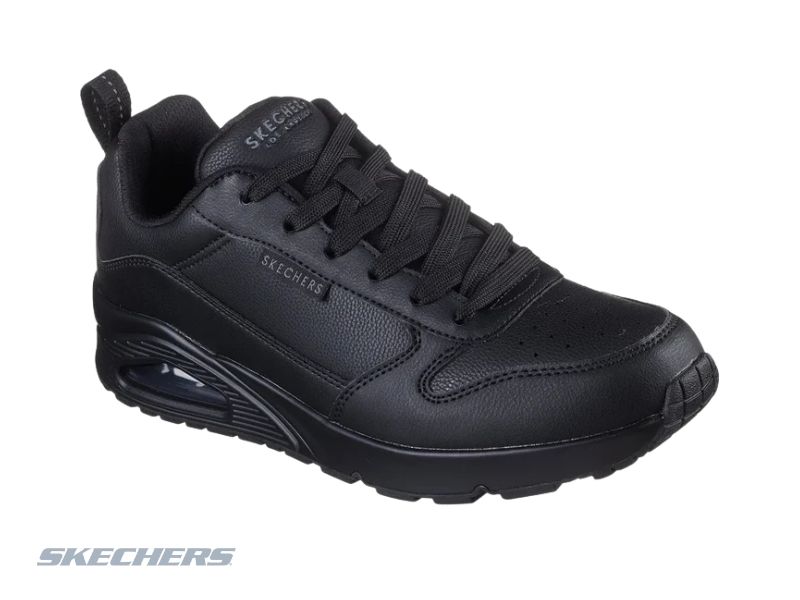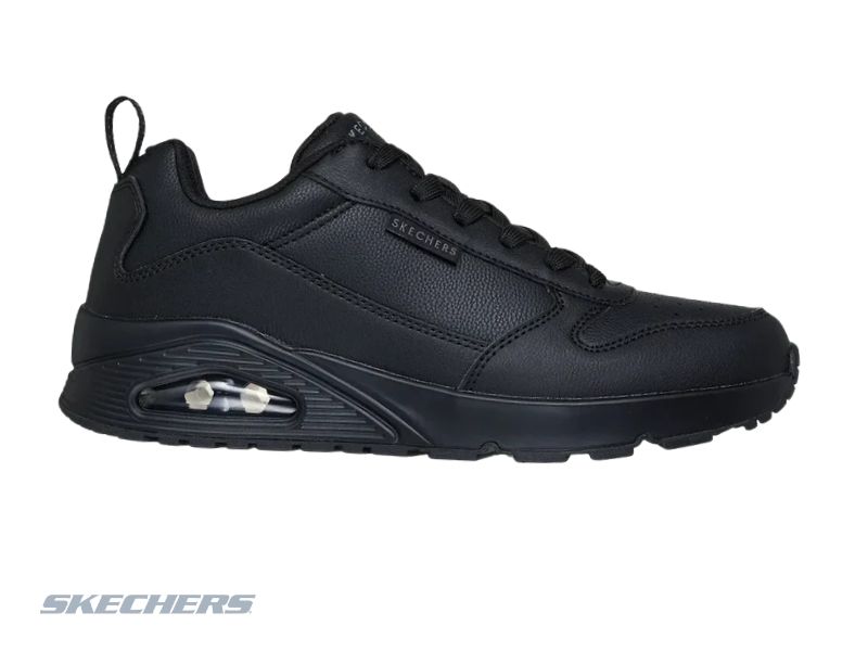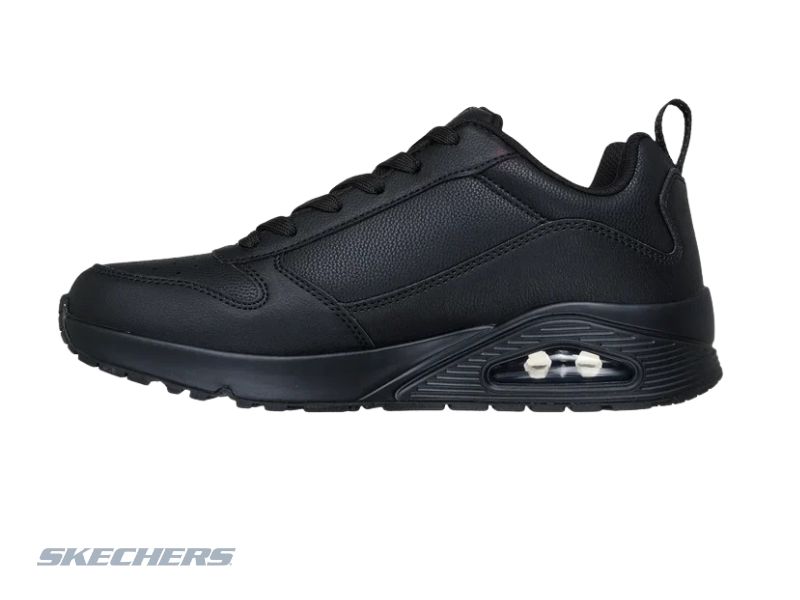 Capellada de cuero sintético, plantilla Air-Cooled Memory Foam y entresuela con cámara de aire visible Skech-Air que brinda gran amortiguación, confort y estilo urbano para el uso diario.