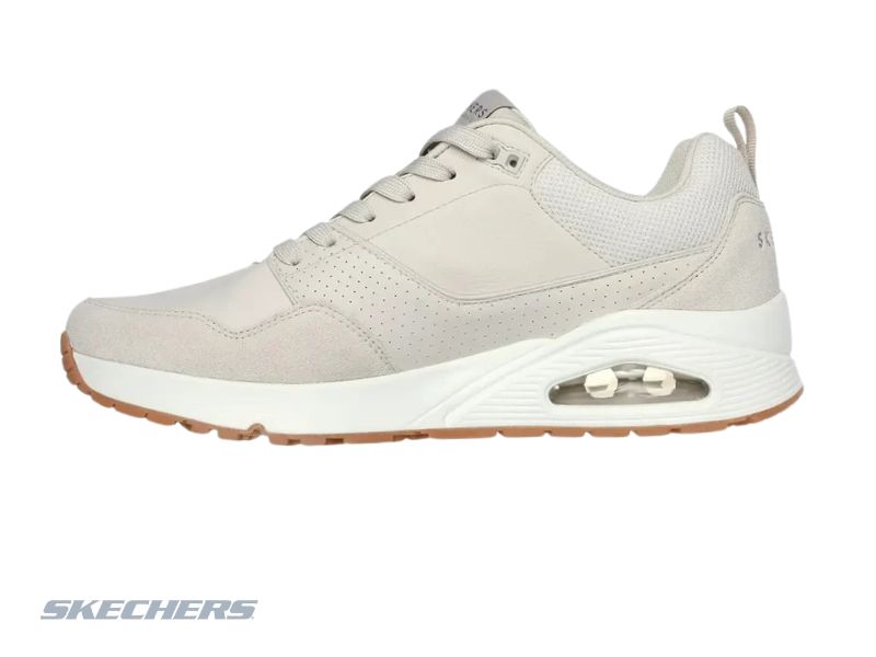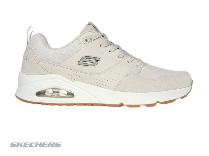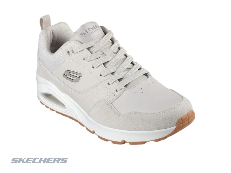 Diseño jogger de estilo retro, capellada combinada de cuero, gamuza y duraleather, plantilla Air-Cooled Memory Foam y entresuela con cámara de aire Skech-Air que brinda gran amortiguación y comodidad
